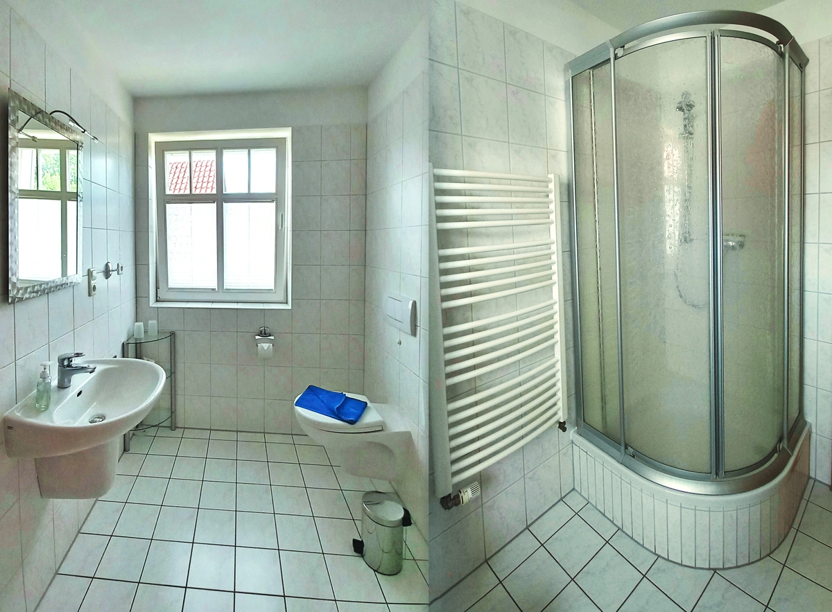 Das Bad ist mit Duschkabine, Waschbecken und WC ausgestattet.